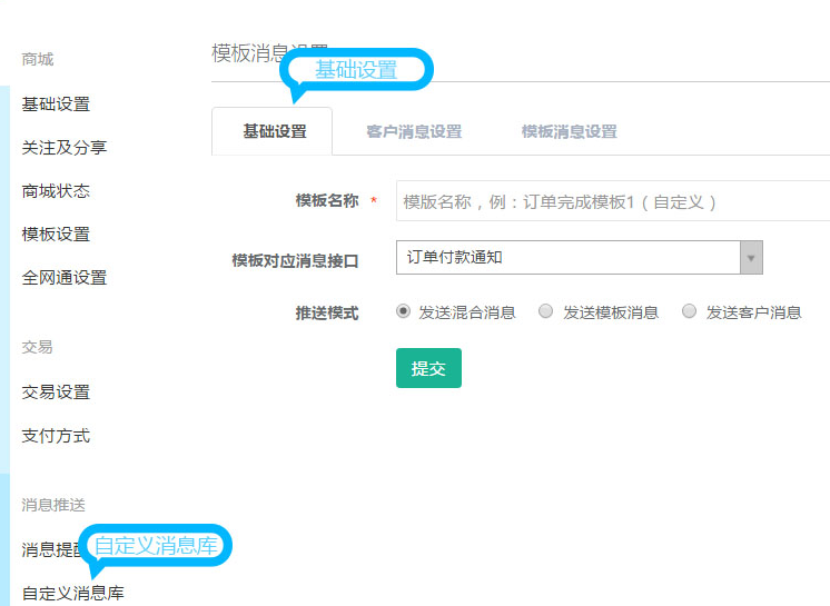 首先要在基礎(chǔ)設(shè)置中選擇需要推送的模式,然后在選擇相應(yīng)的模板對(duì)應(yīng)接口,單機(jī)設(shè)置——自定義消息庫(kù)——基礎(chǔ)設(shè)置,參見(jiàn)下圖: