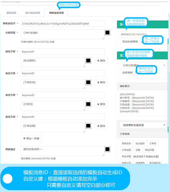 聆科商城的自定義模板消息庫(kù),是商家根據(jù)自己想要發(fā)送的信息內(nèi)容進(jìn)行自定義設(shè)置,跟系統(tǒng)默認(rèn)的通知方式有所不同,此處因?yàn)槭亲远x的,所以必須還得從接入商城的微信公眾號(hào)后臺(tái)中復(fù)制需要使用的模板編號(hào),系統(tǒng)就會(huì)自動(dòng)獲取了模板ID信息,無(wú)需再將模板ID再次復(fù)制,參數(shù)信息也會(huì)在相應(yīng)位置中,只需要填寫自定義的信息即可,具體操作設(shè)置如下: