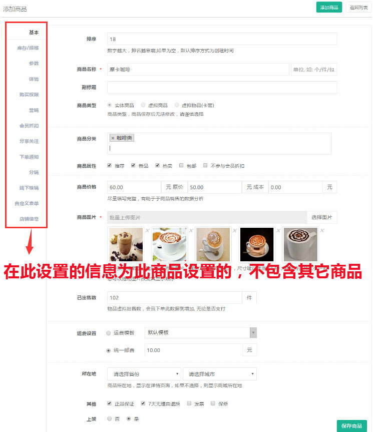 填寫商品的“基本信息”,“購(gòu)買權(quán)限”,“商品營(yíng)銷”等(所有功能設(shè)置僅限于某一商品,不包含商城內(nèi)所有商品的設(shè)置),參見(jiàn)下圖: