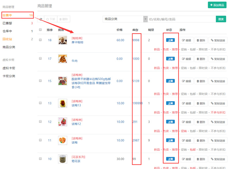 可對(duì)“上架”狀態(tài)的商品,點(diǎn)擊