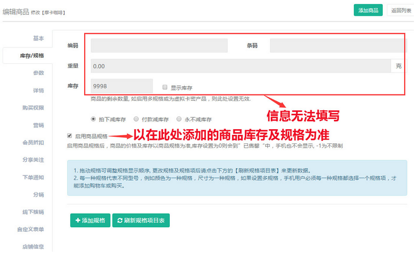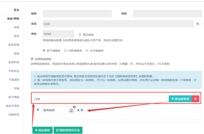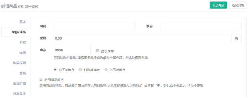 聆科微商城·設(shè)置商品庫存/規(guī)格