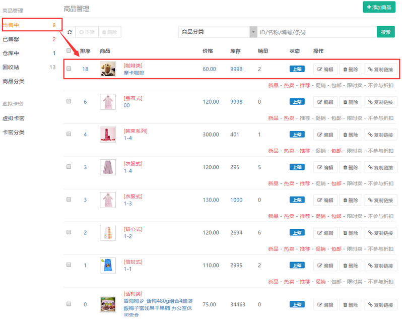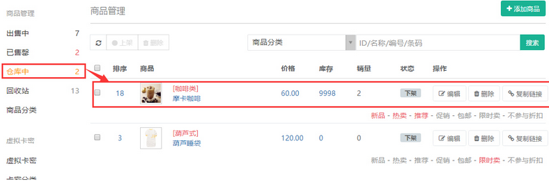 填寫商品”庫存“,則保存后已上架的商品在”出售中“列示,下架的商品在”倉庫中“列示“,參見下圖: