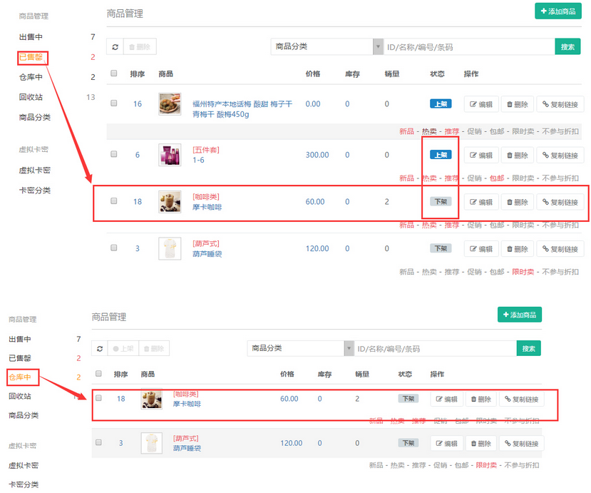 未填寫庫存,則上架或下架的商品在”已售罄“中列示,同時(shí)下架的商品也在”倉庫中“列示,參見下圖: