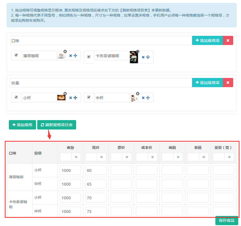 針對添加的規(guī)格進(jìn)行填寫庫存價(jià)格等信息,參見下圖: