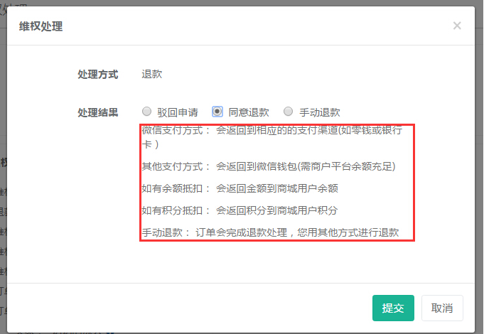 買家申請(qǐng)退款或退貨或換貨時(shí),則在商城后臺(tái)【訂單】——【維權(quán)申請(qǐng)】中進(jìn)行列示,商家點(diǎn)擊【維權(quán)處理】——【 處理申請(qǐng)】,根據(jù)買家提交的申請(qǐng)類型進(jìn)行選擇處理,以退款為例,參見下圖: