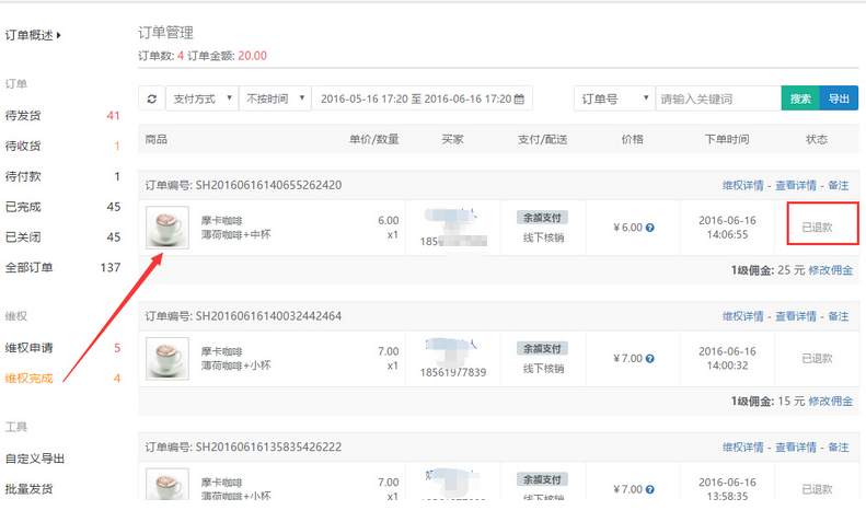 商家如果選擇的維權(quán)處理結(jié)果為“手動(dòng)退款”,則需要商家與買家進(jìn)行線下溝通進(jìn)行其他方式的退款,則此申請(qǐng)的維權(quán)訂單會(huì)完成退款處理,參見下圖: