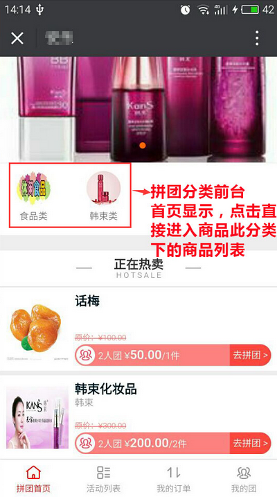 排序數(shù)字填寫的越大,越靠前顯示,選擇“是否拼團首頁顯示”為“是”時,則會在前臺顯示分類,點擊即可進(jìn)入分類下的商品,反之則不顯示,參見下圖:
