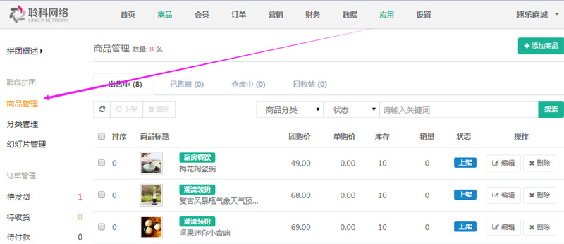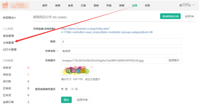 添加商品前首先要添加拼團商品的分類,點擊【應(yīng)用】——【聆科拼團】——【分類管理】,參見下圖: