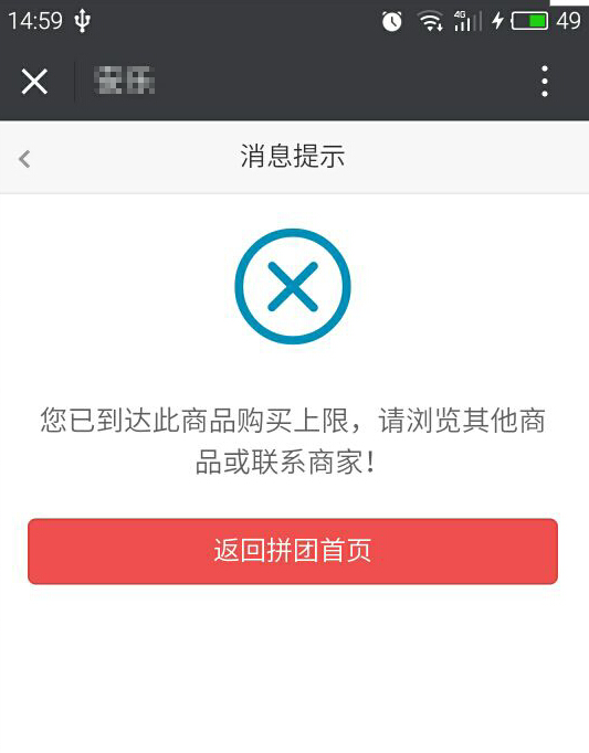 3、購買次數(shù)限制填寫是限制買家個人購買商品的次數(shù),如果不設(shè)置則沒有次數(shù)限制,例如次數(shù)限制為1此,則買家拼團購買過此商品后再次購買時,系統(tǒng)會給予相應(yīng)提示,參見下圖: