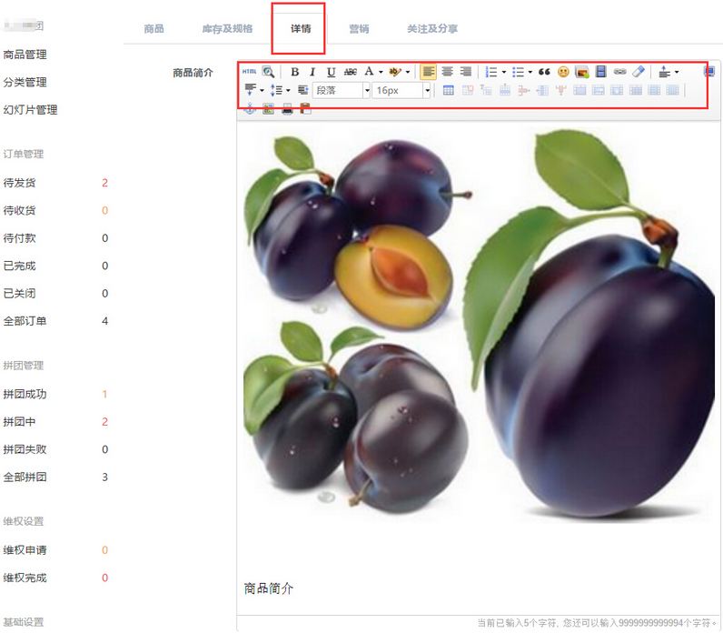 填寫商品有關(guān)的文字及上傳商品圖片,買家點擊需要購買或拼團的商品即可查看,參見下圖: