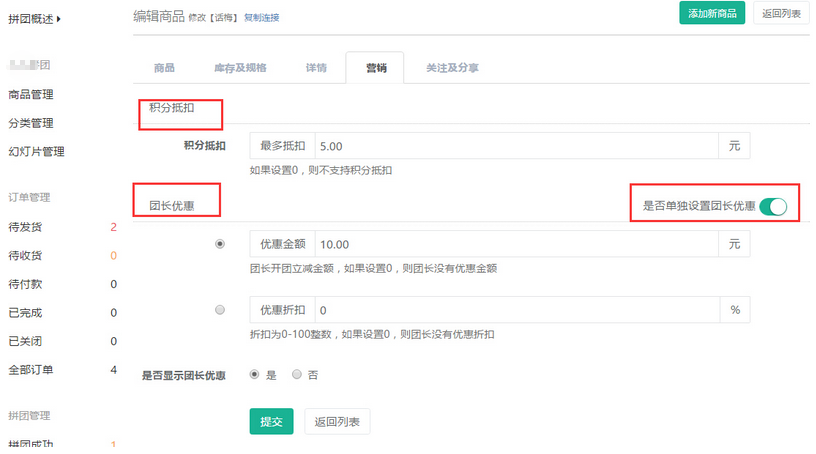 拼團某商品可進(jìn)行設(shè)置積分抵扣,開啟團長優(yōu)惠營銷設(shè)置,此處的設(shè)置只某個商品而不針對整個拼團的商品,參見下圖: