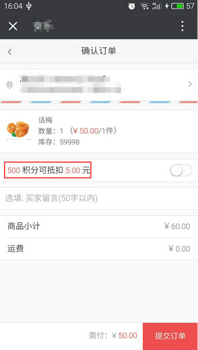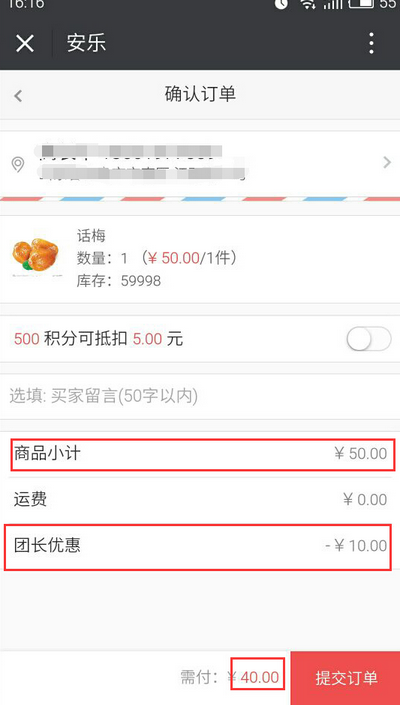 例如:選擇的優(yōu)惠方式為金額,設(shè)置優(yōu)惠金額為10元,開團的買家購買商品為50元,則團長確認(rèn)提交訂單時只需付款50-10=40元即可,參見下圖: