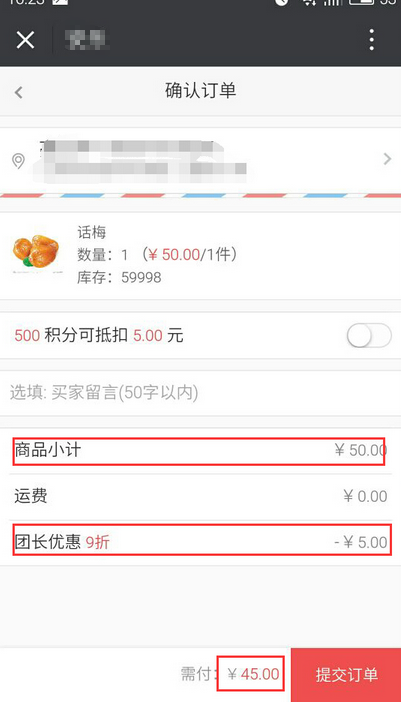 選擇的優(yōu)惠方式是折扣,設(shè)置優(yōu)惠折扣為90%,開團的買家購買商品為50元,則團長確認(rèn)提交訂單時只需付款50*90%=45元即可,參見下圖: