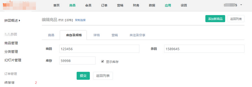 【商品管理】——【添加商品/編輯商品】,設(shè)置商品的基本信息,商品庫存、詳情,商品的營銷活動等,下圖為設(shè)置添加商品信息: