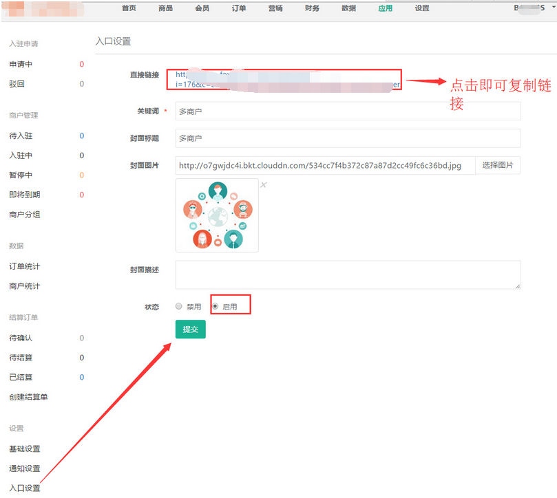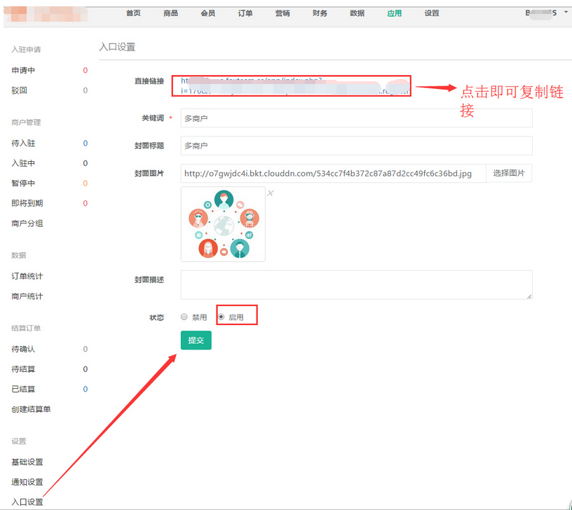 會員申請入駐到商城中成為多商戶銷售產(chǎn)品,在【入口設(shè)置】將鏈接復(fù)制到自定義菜單或啟用關(guān)鍵詞,申請入駐的商家就可以再關(guān)注的商城自定義菜單或輸入關(guān)鍵詞進行申請,參見下圖:
