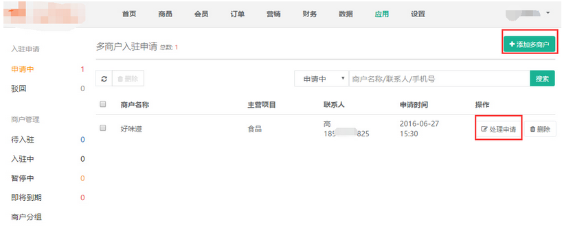 提交的申請入駐會在商城的【申請中】統(tǒng)計,商家直接進行處理操作即可,參見下圖: