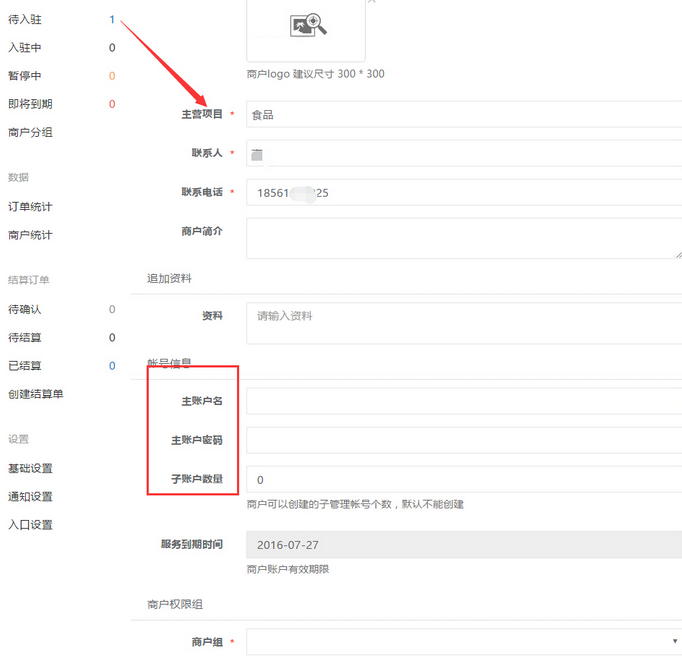 處理申請通過的多商戶在【待入駐】中進行統(tǒng)計列示,在“待入駐”中添加上主賬戶名、密碼及設(shè)置子賬戶的數(shù)量,商城只添加申請多商戶的主賬戶,子賬戶需要多商戶商家主賬戶進行添加分權(quán),參見下圖: