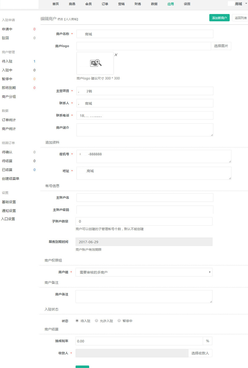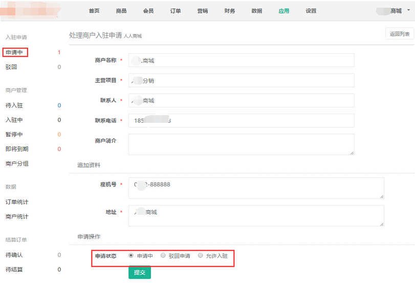 聆科微商城·處理申請(qǐng)的入駐多商戶