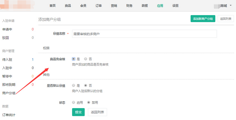 商戶分組權(quán)限分商品審核和商品免審核的,商品審核是商戶上傳商品時(shí)需要商城指定人員的審核,審核通過后才能在商城中顯示,商品免審核的是商戶上傳的商品直接就可以在商城中顯示。